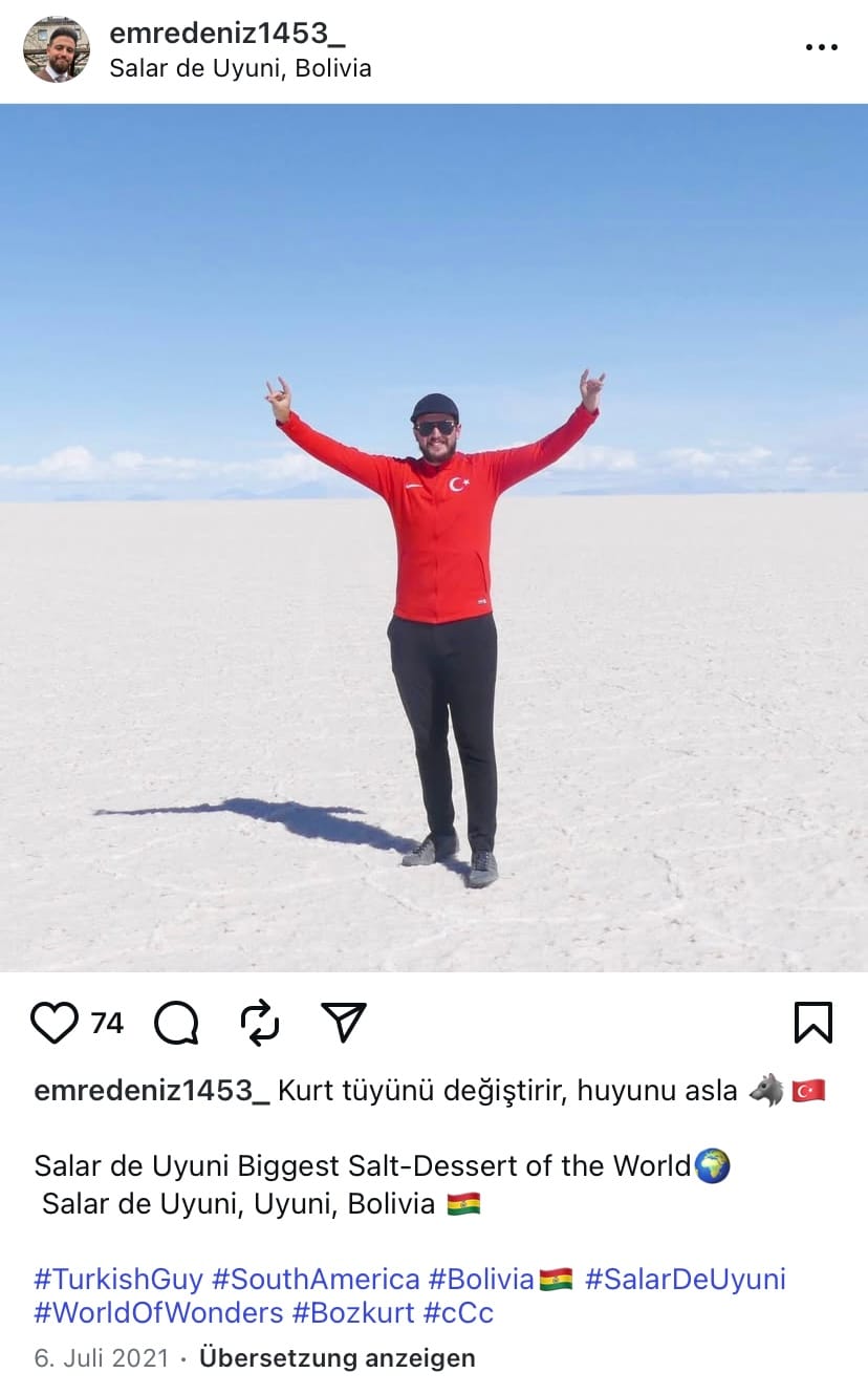 Deniz Instagram profillerinden birisinde Bolivya'daki bir çölde görülüyor. Türk hilali bulunan kırmızı bir eşofman üstü giymiş ve iki elini “bozkurt selamı” için kaldırmış. Deniz'in seçim kampanyası için kullandığı ikinci Instagram profilinde bu fotoğraf yok, ancak her iki profildeki diğer fotoğrafların çoğu aynı. “ATF Gelsenkirchen” Instagram sayfasında yer alan bir videoda ise Deniz'i mangalın başında dururken görebilirsiniz.